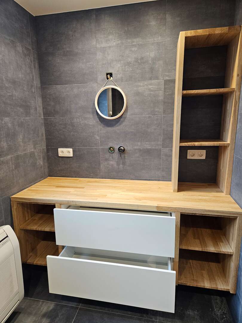 Zwevend badkamer meubel. Combinatie van plaatmateriaal en massief hout met Tip-on lades van Blum. Massief hout afgewerkt met matte vernis.