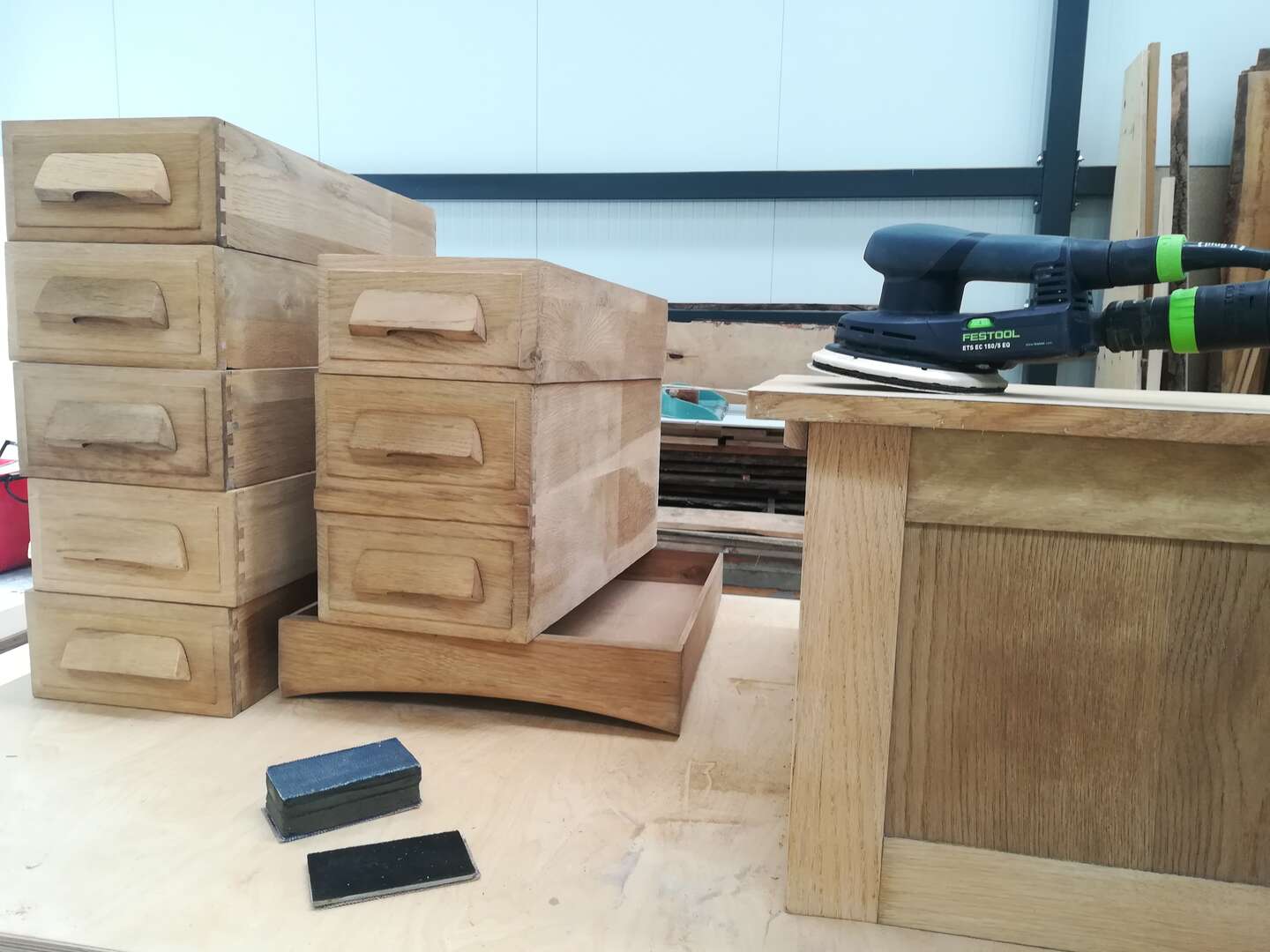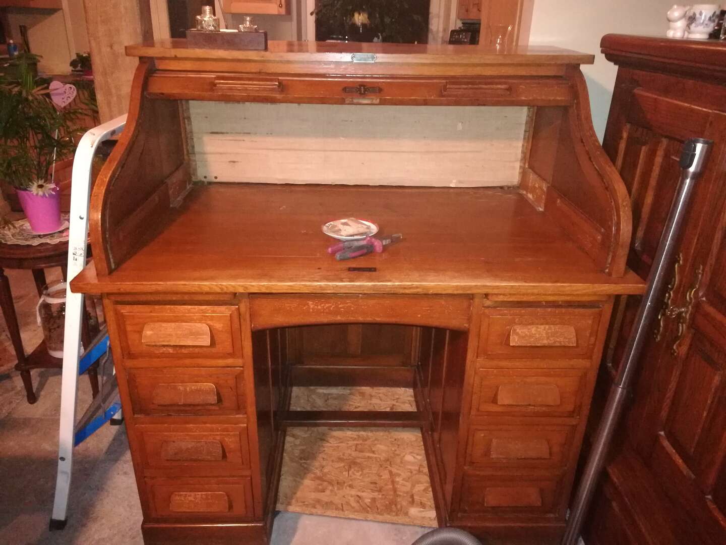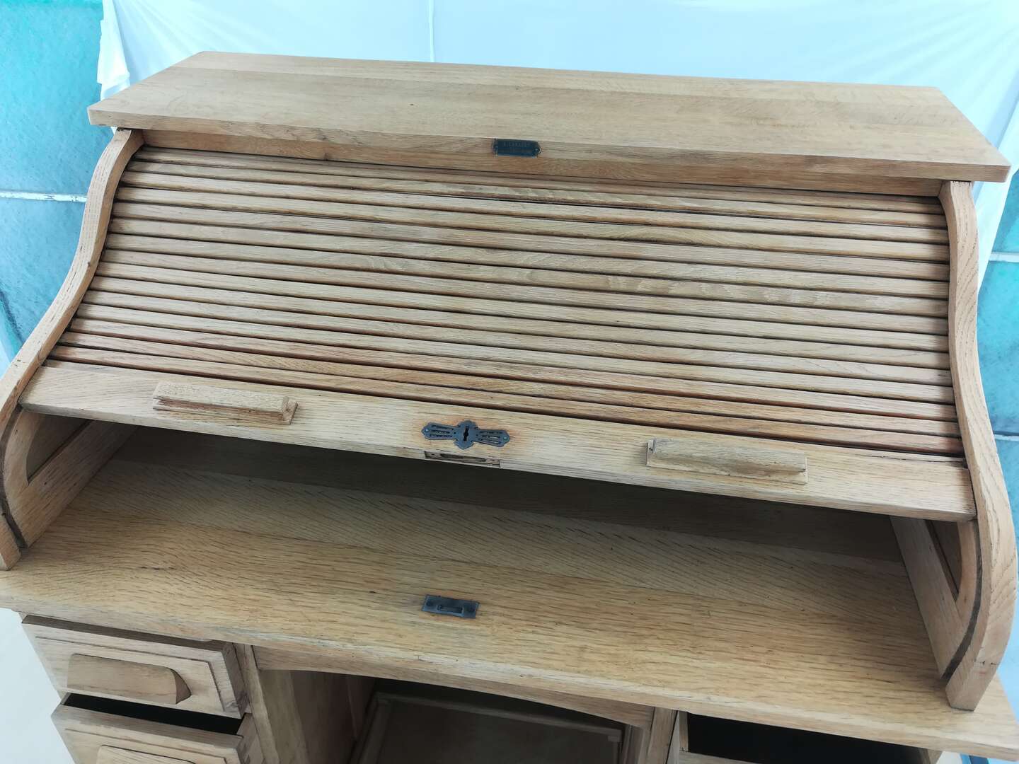Deze secretaire werd ontdaan van zijn oude laag bruine vernis waardoor de mooi natuurlijke structuur van het eiken hout terug zichtbaar werd. Ook het rolluik ging niet meer vlotjes naar boven.